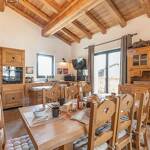 . a dining area with fitted kitchen, island and 2 breakfast tables,