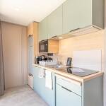 Cuisine/Séjour : réfrigérateur, plaques induction 3 feux, Lave-vaisselle, four micro-ondes, TV.
