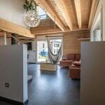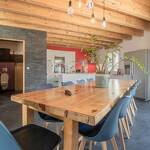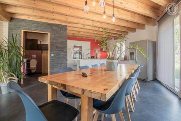 Maison comprenant le studio de vacances des propriétaires au rez-de-chaussée. Rez-de-chaussée : salon-séjour-cuisine ouvert sur une large terrasse, WC indépendant, accès au garage. 1er étage : mezzanine avec coin détente, 3 chambres dont une suite parentale avec salle d'eau (1 lit 2 personnes 180x200 cm / 1 lit 2 personnes 160x200 cm et 1 lit 1 personne 90x190 cm / 1 lit 2 personnes 160x200 cm et 1 lit 1 personne 90x190 cm), salle de bain avec WC (douche et baignoire). Garage. Bois de chauffage inclus.