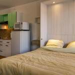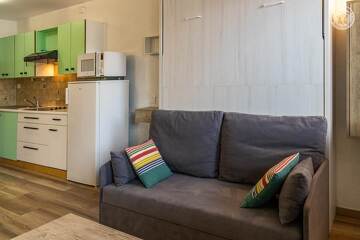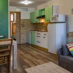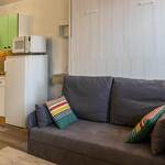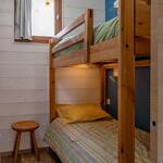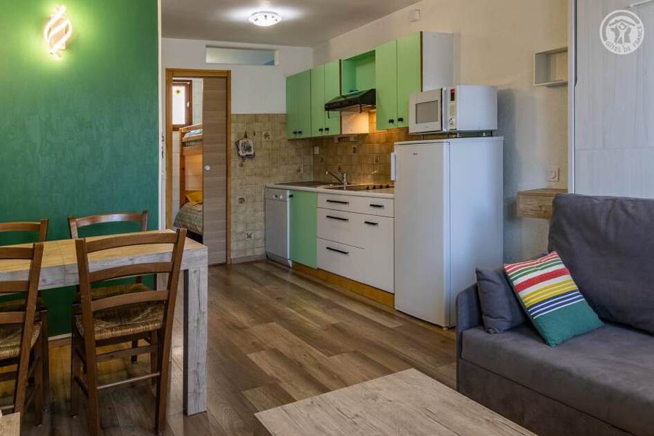 Gite au rez-de-chaussée (entrée commune aux 4 logements de la maison) comprenant : une entrée, un séjour-cuisine coin salon (1 lit escamotable 2 personnes 140x190 cm), 1 chambre cabine (2 lits superposés 80x190 cm), une salle d'eau (douche avec WC). Lave-linge combiné séchant.