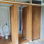 Un espace sanitaires collectif avec 3 douches et 2 WC avec un poêle à bois