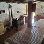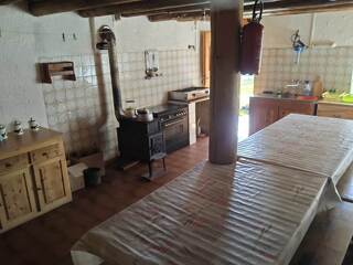 Une grande cuisine : plaque de cuisson, four à gaz, frigo et un poêle à bois